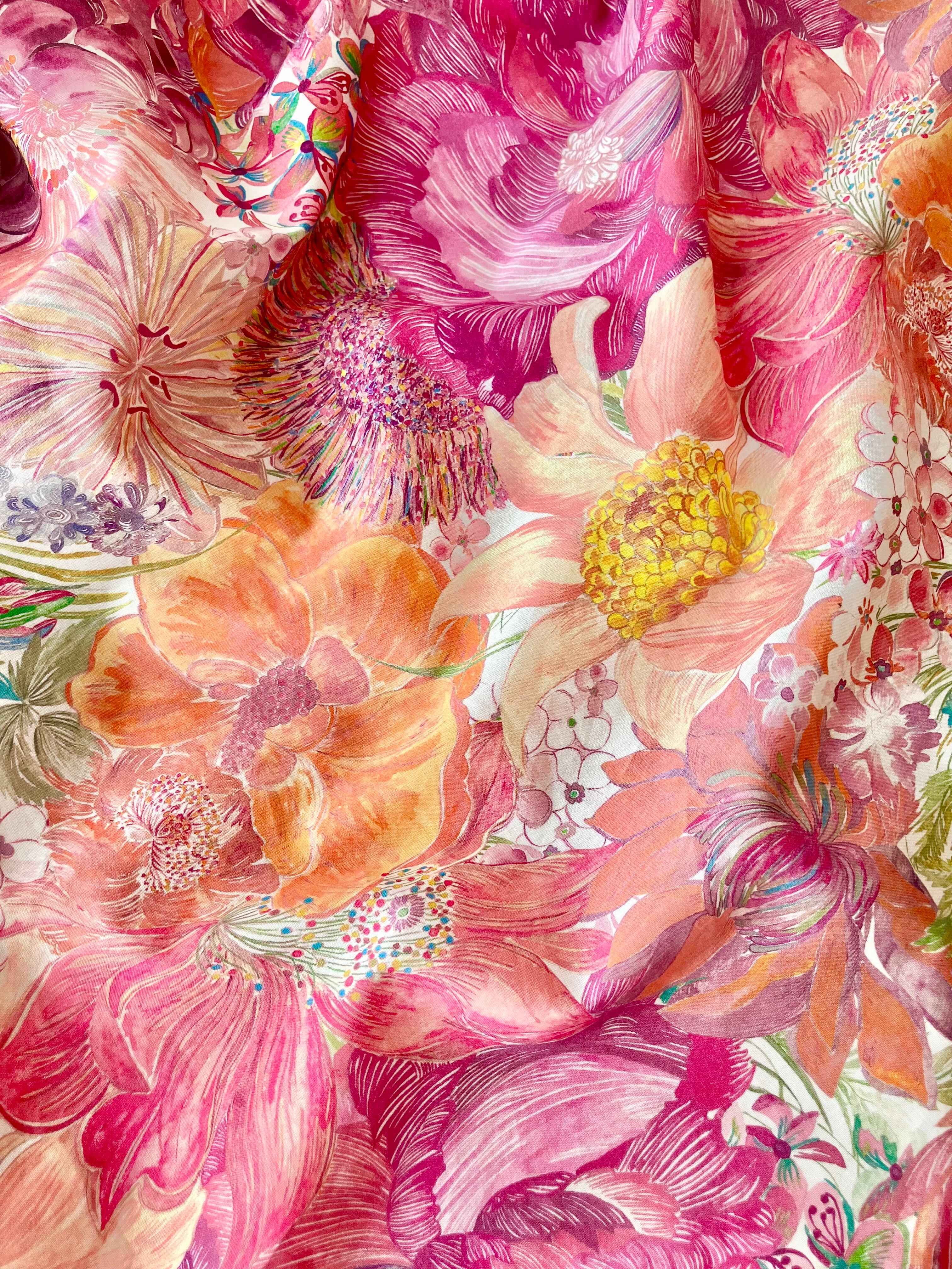 表地は温かみのあるオレンジやピンクを基調とした、大判花柄が美しいリバティ生地。