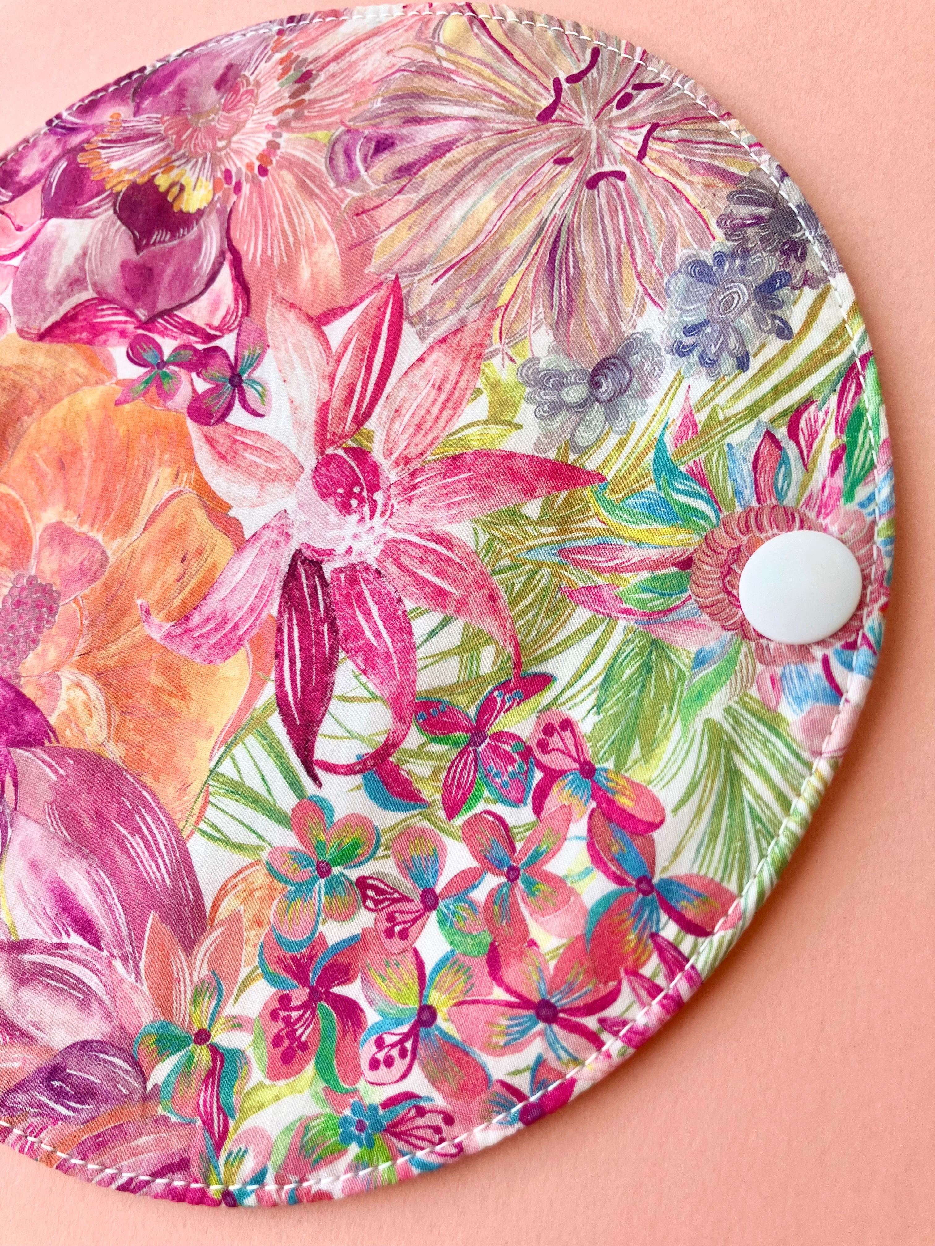 表地は温かみのあるオレンジやピンクを基調とした、大判花柄が美しいリバティ生地。