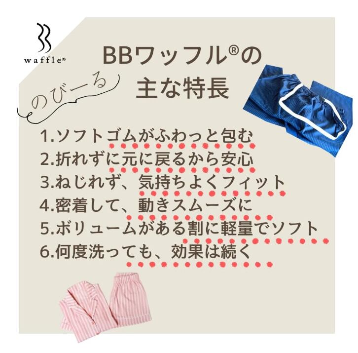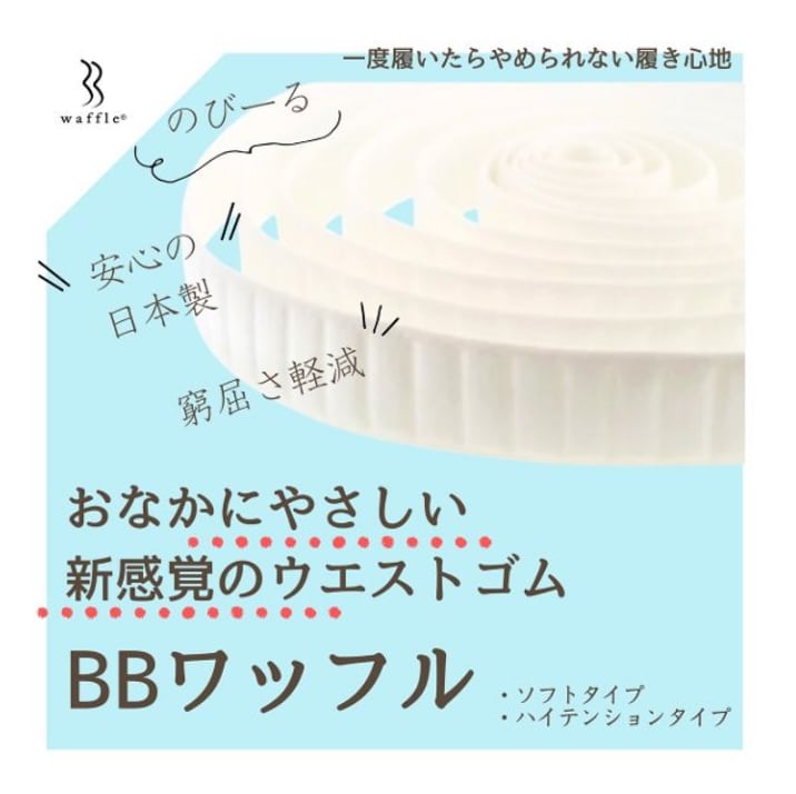 ウエストゴムは、窮屈観やゴムのねじれを軽減した「BBワッフル」という日本製の物を使用し、締め付け感ゼロのとても軽い履き心地です。