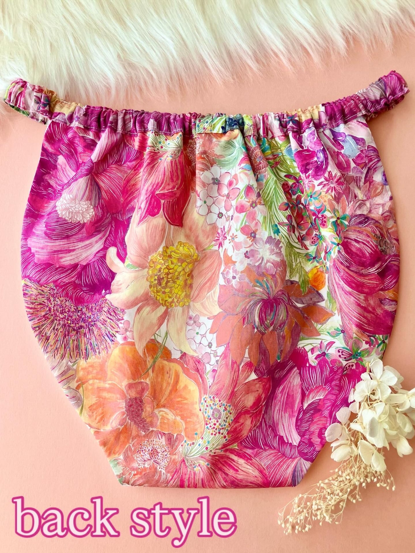 表地は温かみのあるオレンジやピンクを基調とした、大判花柄が美しいリバティ生地。